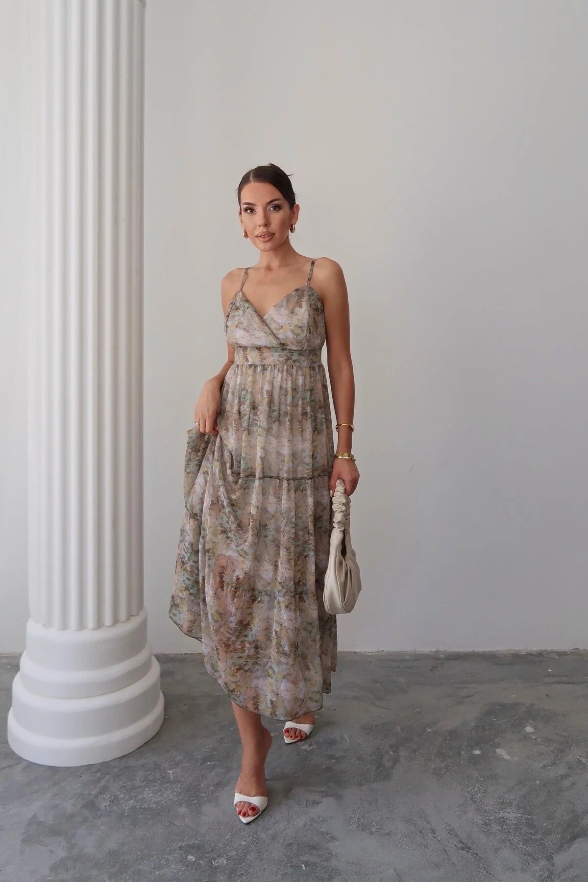 فستان شيفون مطبوع بتصميم أنثوي ناعم، مصنوع من قماش الشيفون الخفيف الذي يمنحك إحساسًا بالراحة والانسيابية مع كل حركة. يتميز بقصّة صدر متداخلة وحمالات رفيعة تضيف لمسة أنيقة، مع تنورة متعددة الطبقات تمنح الفستان مظهرًا راقيًا ومناسبًا للإطلالات الصيفية والنهارية